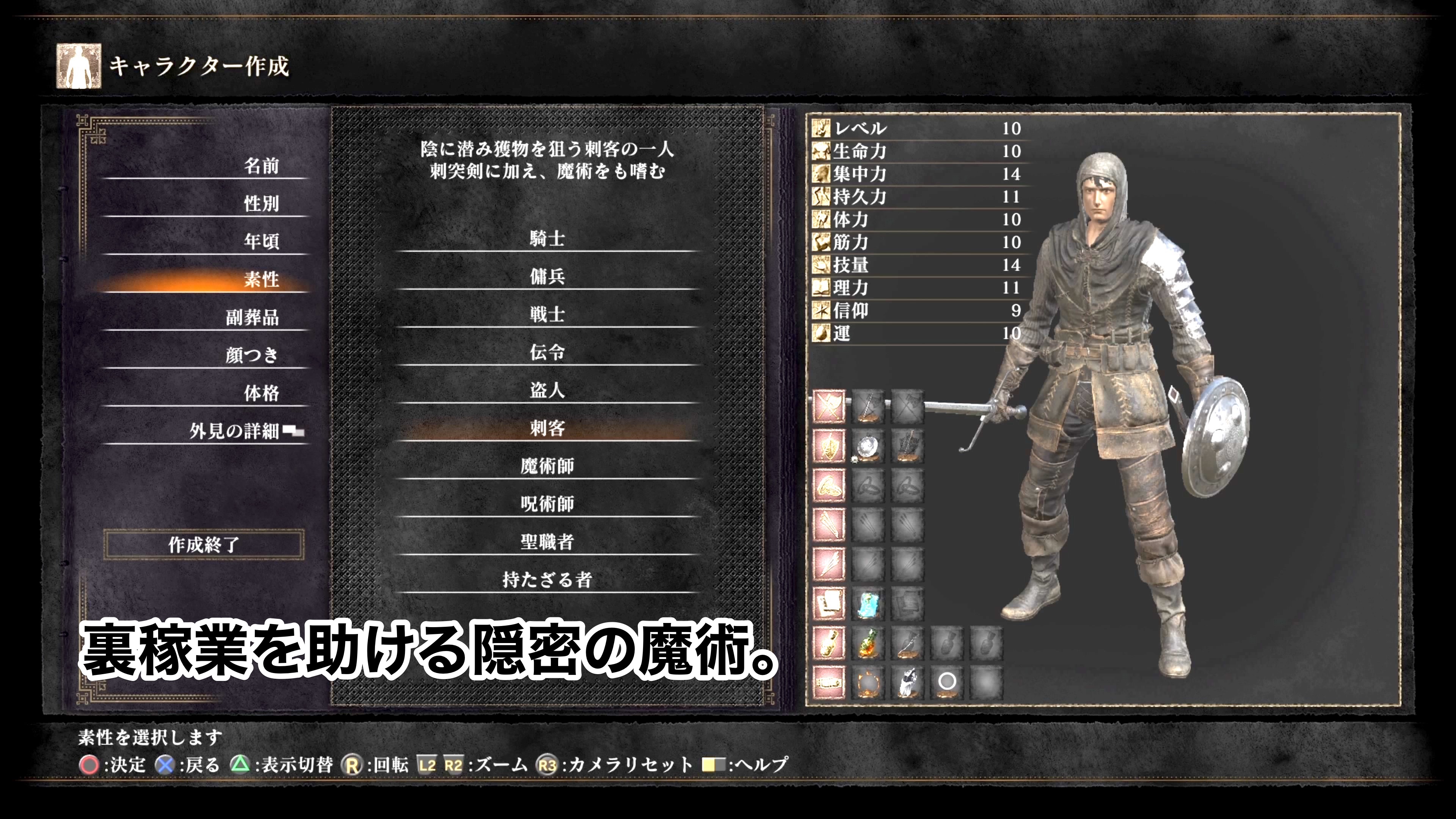 キャラクター作成画面では素性ごとのステータスはわかりますが、装備品の詳細がわからないので一覧にしました。