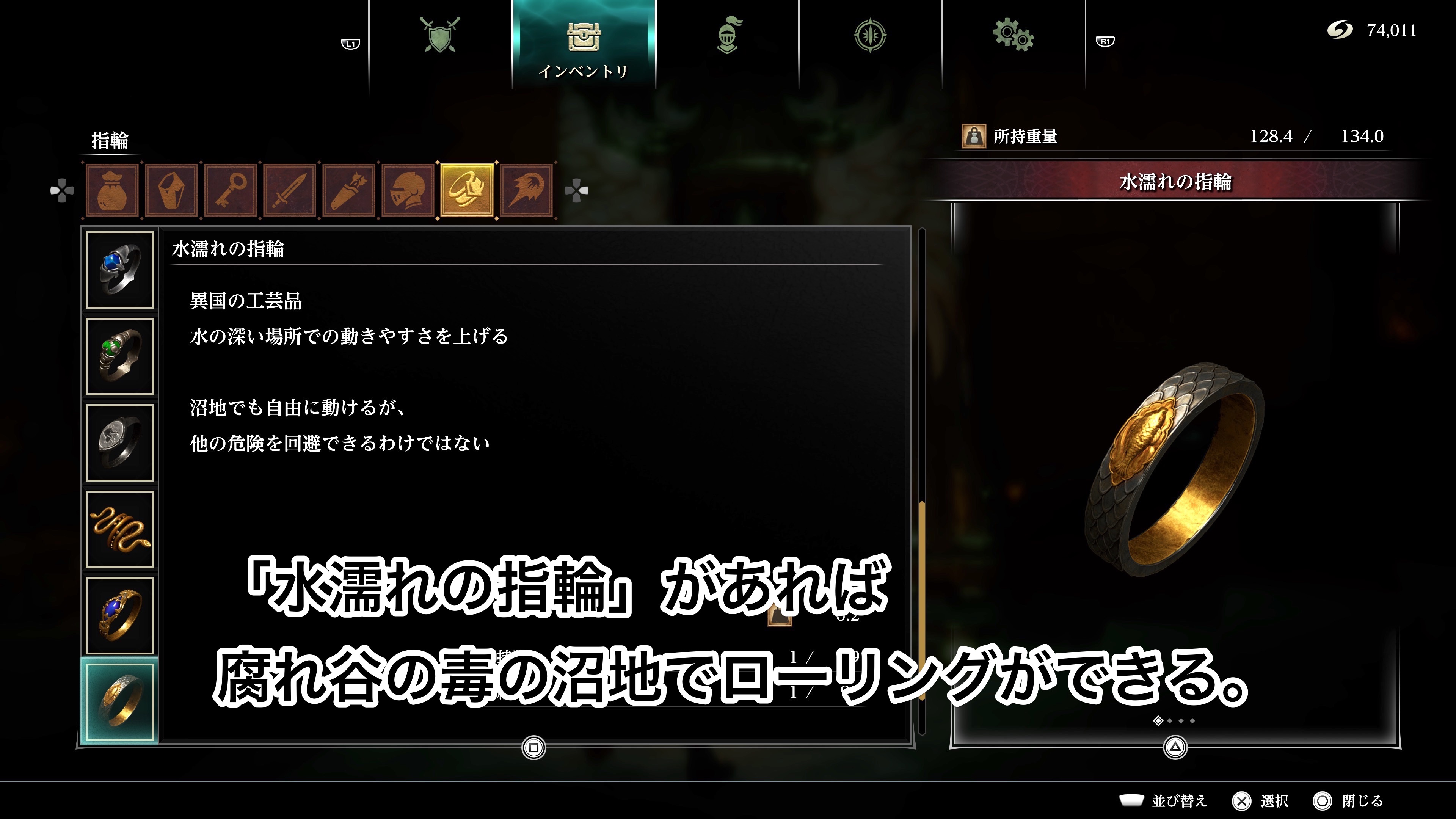 アイテム発見力が上がる「天為の指輪」と、沼地でローリングできるようになる「水濡れの指輪」があるといいです。